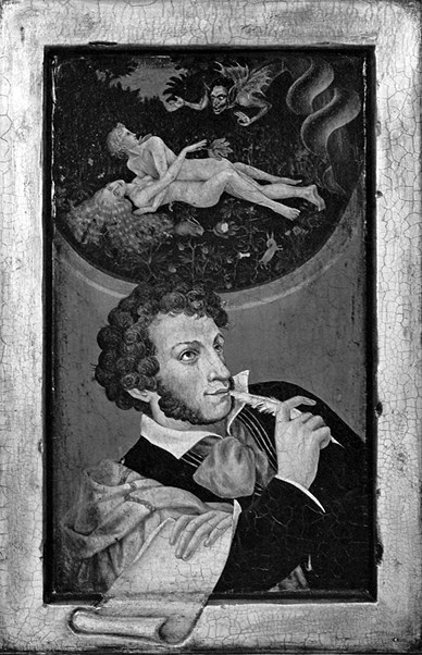 Наконец, очень похоже, что шаловливая художница придала некоторые пушкинские черты портрета Пруцких своему изображению коварного беса как в сцене воображаемого поэтом соития Адама и Евы (см. илл. слева сверху), так и в самом триптихе (см. илл. сверху).