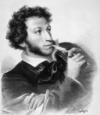 Пушкинский образ, как несложно установить, здесь целиком списан с портрета работы А. С. Пруцких (так называемый Пушкин с пером, 1949), включавшегося в советские издания поэта (художница между тем явно изменила взгляд Пушкина, придав ему весьма лукавое выражение).