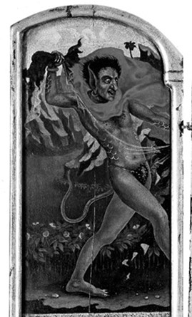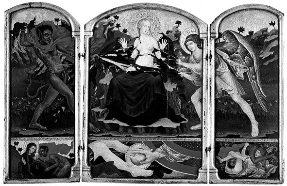 Интересующее нас изображение поединка Гавриила и Сатаны находится в правом нижнем углу триптиха (художественный «перифраз» слов «кинулись в объятия друг друга»).