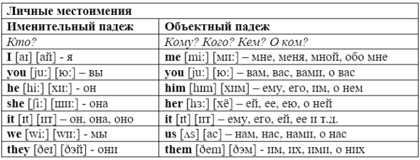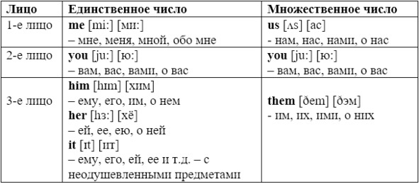 Приведем здесь таблицу английских личных местоимений в объектном падеже (отвечающих на вопросы Кому? Кого? Кем? О ком?):