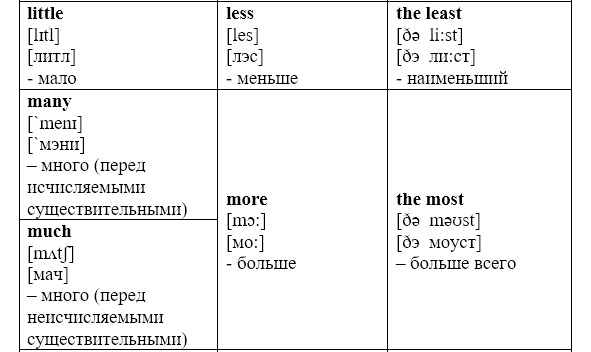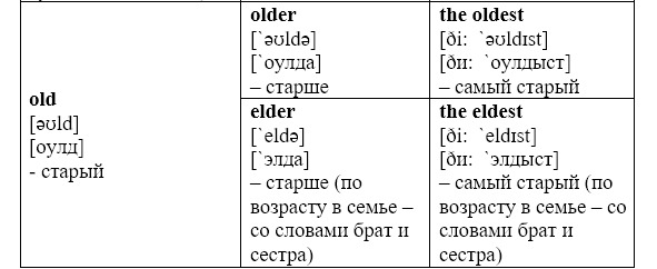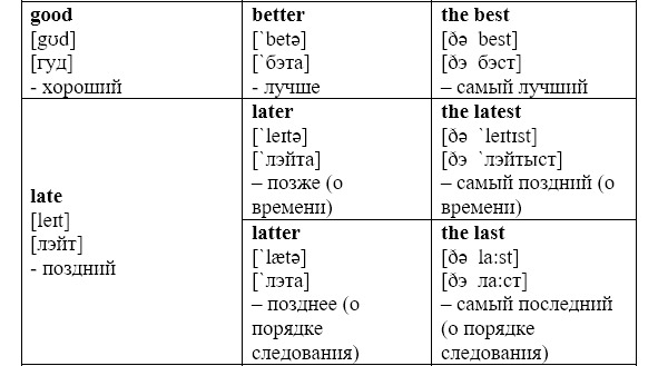 Исключения из правил формирования степеней сравнения прилагательных приведены в следующей таблице: