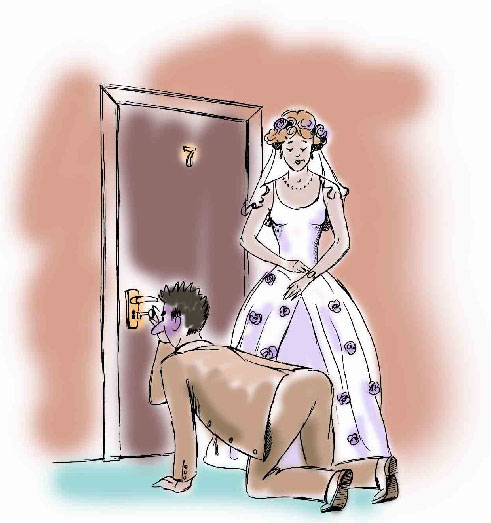 Сыграли свадьбу, гости потихоньку разошлись,Молодожёны в нетерпении в номер понеслись.У двери парень так разволновался – пот бежит ручьём,Что с полчаса не может в скважину попасть ключом.Девчонка погрустнела, пробурчала:Ну ничего себе начало…