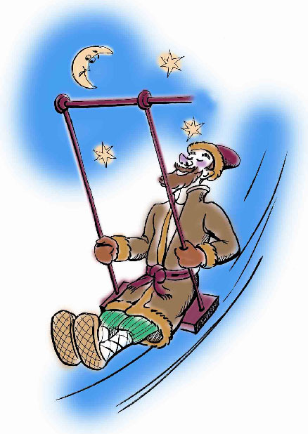 Уж за полночь. Супружеская пара сладко спит,Вдруг кто-то в дверь настойчиво звонит.Муж нехотя поплёлся, дверь открыл спросонок,Глядь, на пороге незнакомый мужичонок.Старик, прости, меня Емелей звать,Ты подтолкни меня, пожалуйста. – Мать-перемать! —Мужик захлопнул дверь, в кровать заковылял,Там всё жене с досады рассказал.Жена стыдит его: Ну что ж ты не помог, позор!Муж, чертыхаясь, плащ накинул и во двор.На улице кричит во тьму: Ты где, Емеля?Да здесь я, здесь, старик, качаюсь на качелях…