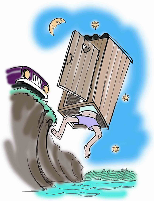 Приехал сын к отцу в деревню, пожил пару дней,Потом и говорит: Отец, кончай смешить людей!Снеси ты свой позорный туалет в садуИ сделай тёплый – в доме, а не на виду.Ты не указывай мне сын. Немножечко обидно…Стоит себе над речкой за деревьями, его ж не видно. —Отец, так это ж не сортир, а полное уродство! —Отстань, сынок, хоть перед папкой не юродствуй!Ну, ладно, – ухмыльнулся сын, а ночью встал,К сортиру джип тихонько подогнал,Упёрся бампером, натужно газанул,И туалет с обрыва в темноту в реку спихнул!Наутро подбегает к сыну злой отец: Свинья!Ты мой сортир спихнул с обрыва? – Нет, не я…Послушай, сын, учись по честному, как люди жить;Признанье сделать – так, считай, прощенье получить.Вот, друг твой, Вася, у отца по пьяни яблоню срубил,Потом признался, и отец его простил…Так, говори мне честно, ты сортир в реку спихнул? —Ну, я… Тут вдруг отец с размаха сыну в ухо намахнул!Ты что? Сам рассказал, как батя Васю своего простил,Когда признался тот, что яблоню его нечаянно срубил…Когда Василий яблоню рубил, пострел,На ней его папаша не сидел!