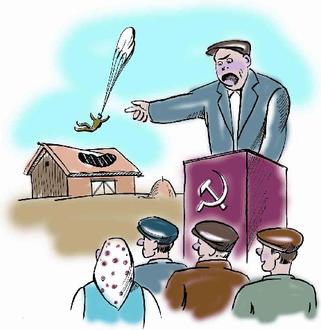 На совещании стран, вступающих в Варшавский мирный договор,Решили дать всем угнетателям народов сокрушительный отпорИ подписали протокол в противовес эксплуататорам поганымПо оказанию гуманитарной помощи отсталым Африканским странам.Встаёт премьер-министр Болгарии: Чтоб прекратить ужасный морМы посылаем десять тысяч ящиков отборных помидор. —А в чём изюминка? – Мы эти ящики из чистого свинца отлили,Чтоб у повстанцев пули были.Встаёт премьер-министр Румынии: А мы от сердцаШлём десять тысяч ящиков отборнейшего перца. —А в чём изюминка? – Там упаковка из булата,Чтобы повстанцы мастерили автоматы…Тут наш премьер обвёл аудиторию тяжёлым взглядом:Мы высылаем яйца, двадцать тысяч штук спецрейсами из Ашхабада.И что, какая-то спецтара предусмотрена при этом? —Да, сапоги кирзовые и синие береты…Солдатские будни