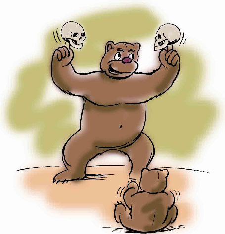 Раз три Медведя возвращаются домой: родители и мелкий.Отец-Медведь бурчит: Кто съел всё из моей большой тарелки?И Медвежонок скалит недовольную мордашку:Кто скушал всё из моей маленькой любимой чашки?Тут мать-Медведица конец их недовольству положила:Так я же вам, придурки, ничего ещё не положила!