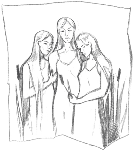 Я открыла рот, чтобы ответить, но ничего не сказала, а только удивленно хлопнула ресницами: из-за угла дома вышли три одинаковые девушки, очевидно сестры-близнецы. Они были одного роста и одной комплекции, длинные светлые волосы собраны в одинаковые пучки, а голубые глаза одинаково подведены коричневым карандашом. Девушки были одеты в легкие приталенные сарафаны желтого, голубого и зеленого цветов, и это единственное, что отличало близняшек друг от друга.