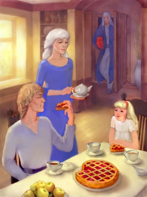 Но Лаэтан беспокоилась зря, Орона ещё не было в доме, а в гостиной она нашла только своих родителей: Эйвор, с довольным урчанием голодного кота, уплетал кусок ягодного пирога роняя на стол крупные крошки.