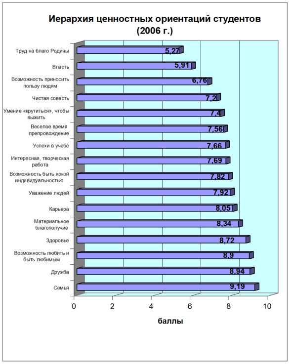 Рисунок 1. Иерархия ценностных ориентаций молодежи в 2006 г. (в баллах)