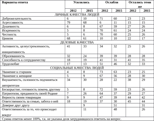 Таблица 1. Динамика представлений россиян о том, как изменились люди и отношения между ними за последние 15—20 лет, %