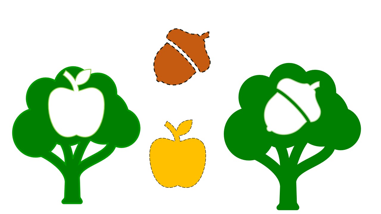 При выполнении задания можно вырезать яблоко и желудь и приложить к трафарету на дереве.