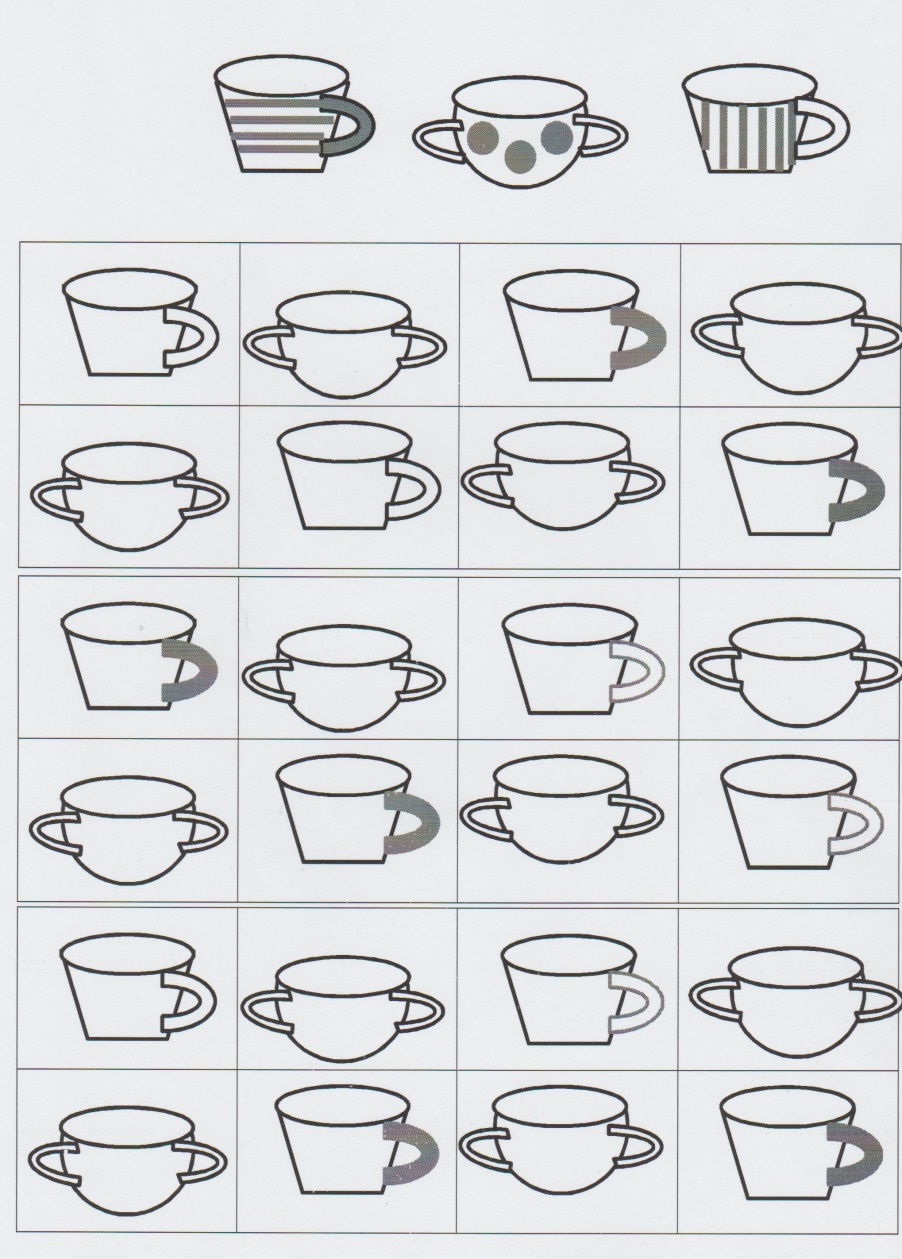 Методические примечания. Посмотреть внимательно на раскраску кружек (горошек ,горизонтальная полоска, вертикальная полоска), и сделать по образцу. Выполнение задания можно разделить на несколько этапов. Сначала выполнить задание с одной кружкой, затем с другой.