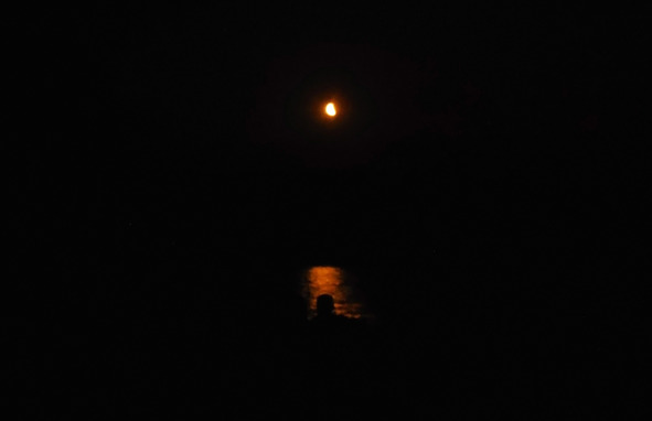 Я спускаюсь к воде и вижу оранжевое чудо, сияющим апельсином выплывающее над деревьями.