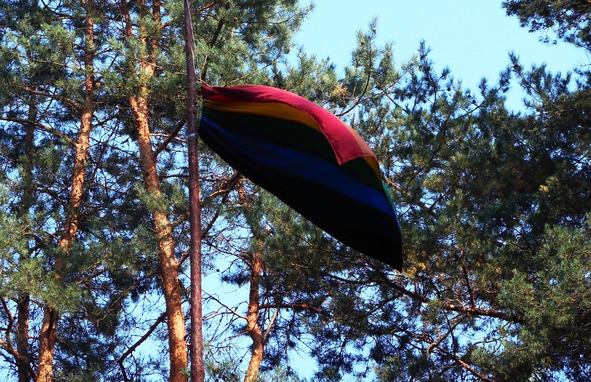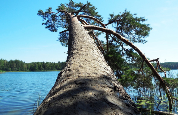 На берегу, сильно наклонившись к воде, растёт большая сосна. Посередине её привязана стропа, на конце которой закреплена палка.