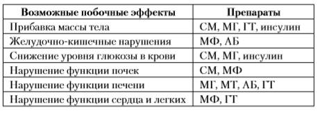 Таблица 5. Возможные побочные эффекты сахаропонижающих препаратов у больных сахарным диабетом 2 типа