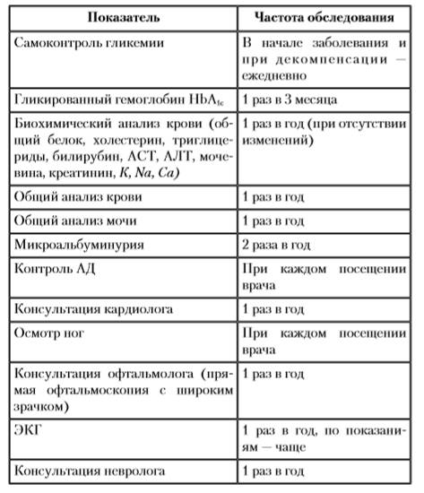 Пациенты, страдающие сахарным диабетом, помимо самоконтроля, должны регулярно наблюдаться у различных специалистов с целью профилактики и своевременного выявления возможных осложнений заболевания. Алгоритм наблюдения больных СД представлен в таблице 6.