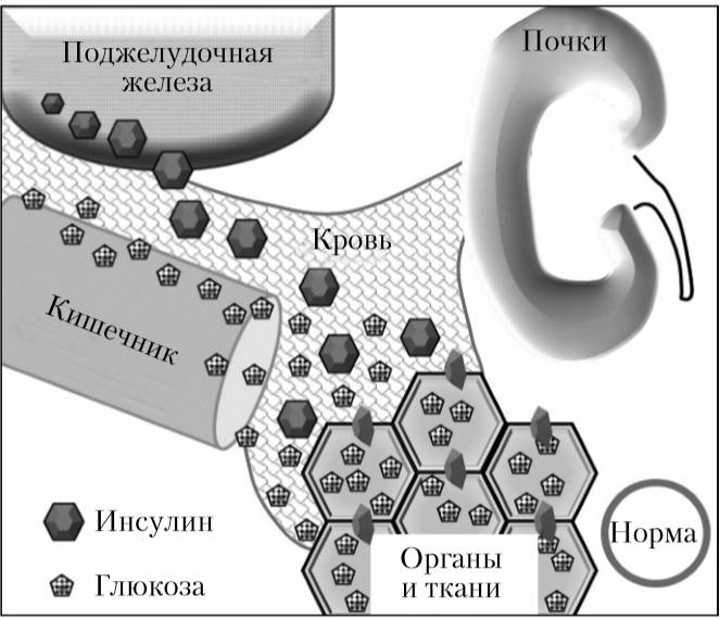 2. Сахарный диабет 2 типа – невосприимчивость клеток органов и тканей к инсулину (инсулинорезистентность), нередко сопровождающаяся дефектом секреции инсулина (рис. 4 Б). Возникает в более зрелом и преклонном возрасте, в связи с чем мы подробнее остановимся именно на этом типе заболевания.