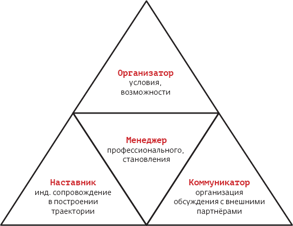 Модель деятельности классного руководителя (организатора профориентационной работы в школе)Модель, которая является основой для методических разработок проекта «Профсреда школам», определяет необходимые позиции в процессе профессионального самоопределения обучающихся. Эта модель (рис. 3) содержит минимально необходимый набор позиций и их функций: организатор, менеджер, коммуникатор, наставник. В основу модели положено представление о профориентации как о системном процессе, в котором создаются условия для получения деятельностного опыта, его осмысления и обсуждения, возможность осуществления пробующих действий в разных сферах, поиск и реализация дополнительных индивидуальных возможностей, прикрепление и погружение в определённый вид труда вместе с наставником, рефлексивное переосмысление получаемого общего образования относительно выстраиваемой профессионализации [5].