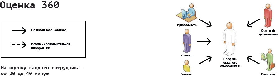 Комплексность системы оценки предполагала включение в число экспертов качества всех участников образовательного процесса: классного руководителя, педагогов-предметников, родителей обучающихся, потому что каждый из них индивидуально видит зону деятельности классного руководителя и оценивает её по-своему. Созданную систему оценки участники разработки назвали «Оценка профориентационной деятельности классного руководителя в формате 360», по аналогии с «Методом 360» описанным П. Уордом [53].