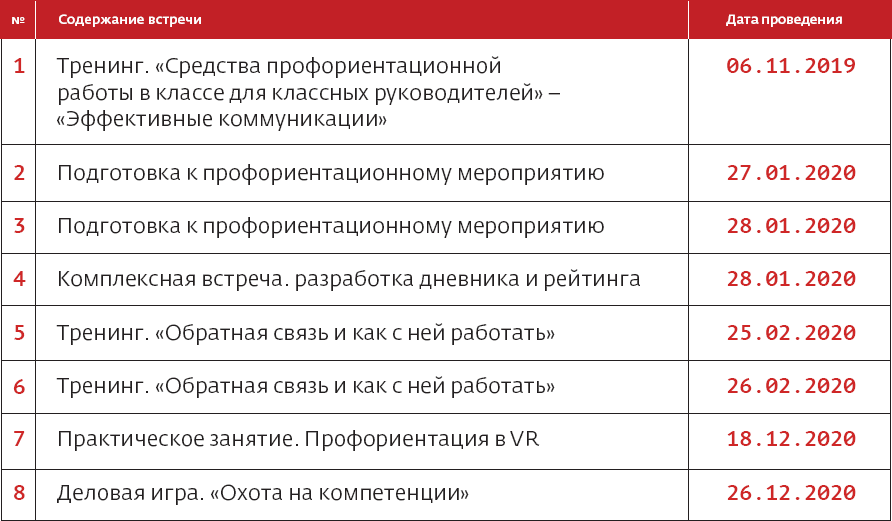 В ходе работ было выявлено (по опросам родителей, школьников), что результативность проекта «Формирование схемы работы кураторов профориентации в образовательной организации» зависела от личностной позиции куратора и компетенций по выбранному направлению. Это позволило сформулировать требования к отбору кураторов и сформировать программы их дополнительного самоопределения. В этих целях для педагогического состава была проведена образовательная программа, включающая педагогические советы, в том числе и с представителями WSR, и тренинги, направленные на обучение профориентационным методикам.