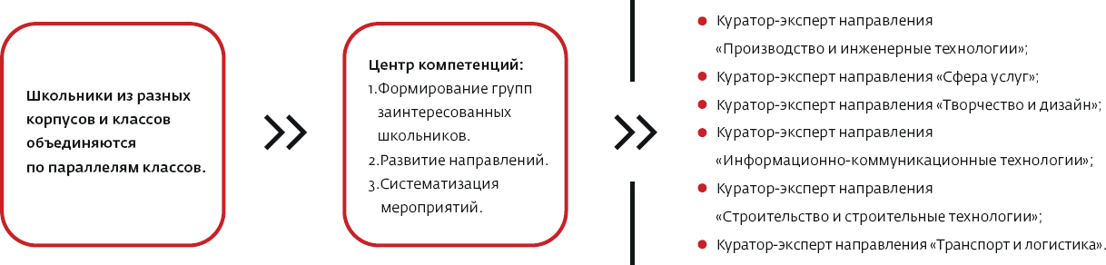 Цели проектаРеализовать новую функцию невозможно без введения ответственных и вписывания системы работ в уже существующие образовательные процессы. Образовательная организация поставила цели: сформировать школьный центр компетенций и организовать его работу по шести направлениям в соответствии с направлениями WorldSkills Russia. Этот центр должен был объединить школьников из разных корпусов и классов по интересам. Интересы были сгруппированы в шесть направлений, для каждого направления был выбран куратор направления (производство и инженерные технологии, сфера услуг, творчество и дизайн, информационно-коммуникационные технологии, строительство и строительные технологии, транспорт и логистика).