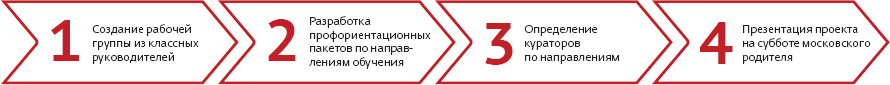 Решение кейса. Методика эффективного выбора направленности класса на уровне основного общего образованияПроект реализовывался поэтапно. На начальном этапе была создана рабочая группа заинтересованных классных руководителей, результатом работы которой стала разработка профориентационных предложений по направлениям обучения. Были определены контролёры направлений, и под их руководством были разработаны презентационные материалы для представления проекта родительской общественности и школьникам. Также контролёры стали организаторами и контролёрами реализации мероприятий на всех этапах.
