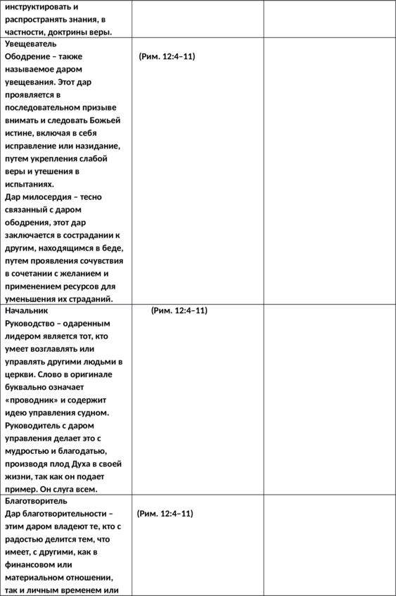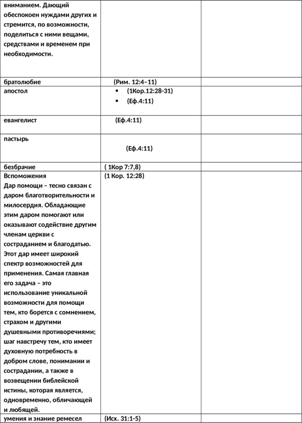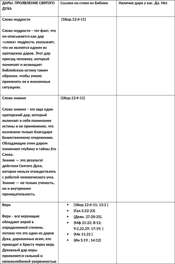 – Теперь нужно увидеть из отрывков из Писания, какие дары есть лично в тебе. Прочитаем отрывки из Библии, сведенные в таблицу, в которых перечислены духовные дары. Для этого держи Библию под рукой. Выдели те дары, которые ты считаешь, подходят тебе.