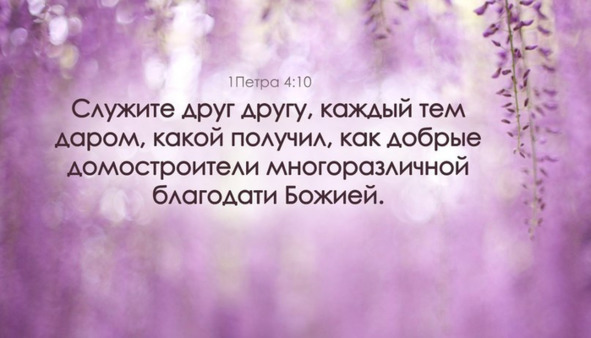 Это очень поможет тебе в размышлении и молитве понять, кто ты и куда движешься. И куда тебе, в самом деле, нужно двигаться. Духовные дары даны тебе не для развлечения, не для поднятия твоего авторитета и гордости, а предназначены для прославления и созидания ЦерквиОни даны не для личного пользования или совершенствования, а для созидания Церкви Христа. Дар евангелиста необходимо использовать для увеличения числа новых членов церкви, дар учительства, увещевания, управления для назидания верующих. Дар вспоможения, гостеприимства, благотворительности для удовлетворения нужд людей, которых доверил нам Бог.Служишь ли ты дарами, которые подарил тебе Бог на благо церкви?Или ты пытаешься прославить себя через эти дары? (1 Пет. 4:11) (Еф. 4:11—16; 1 Кор. 12:7; 1 Пет. 4:10).