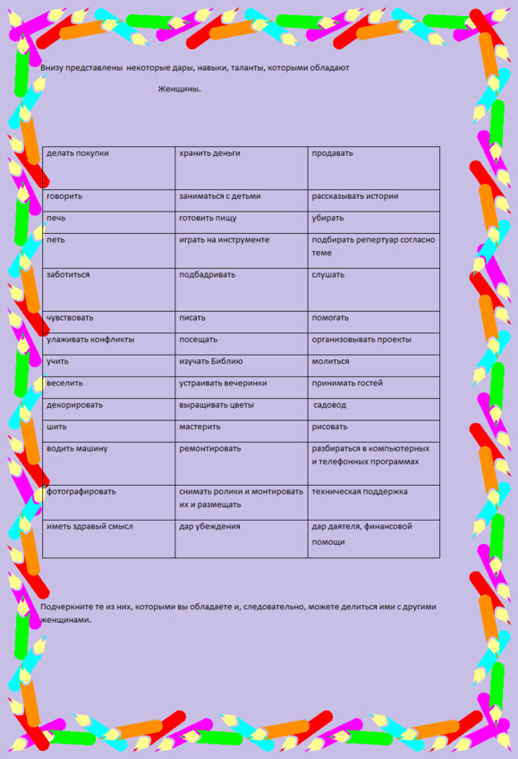 В каких конкретных видах служения в вашей церкви, по твоему мнению, ты могла бы наиболее полно проявить свои духовные дарования, и свои природные способности? А как смогла бы применить их в женском служении? 11.