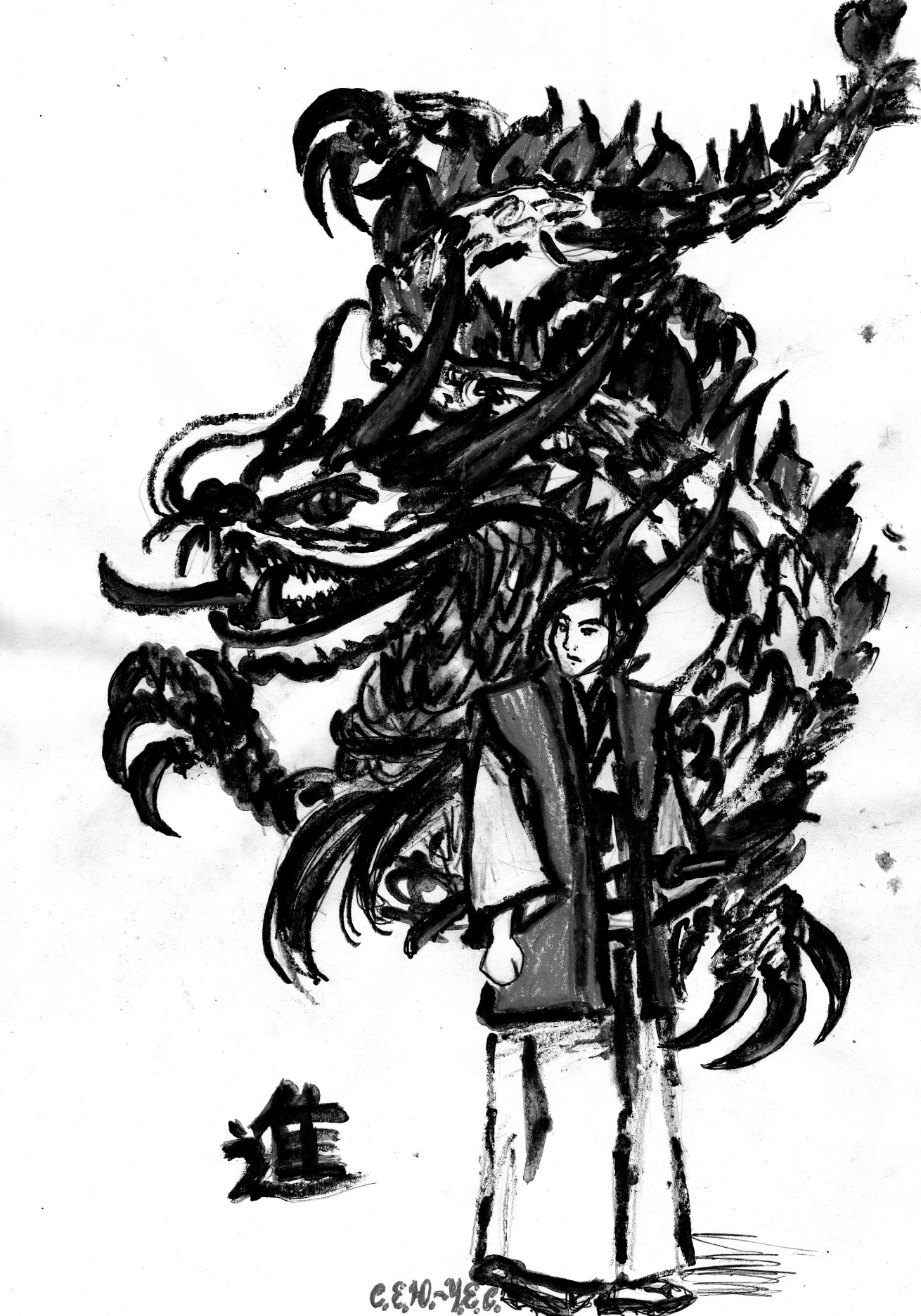 А когда пелена боли на миг упала, когда мой взгляд невольно поднялся к небу, то я на несколько мгновений увидел взлетевшего надо мной воина. Его глаза красные с узкими щелками зрачков, а кожа белая. И ещё два длинных слегка изогнутых рога на голове. А из выхваченной им катаны вырвался и заревел огромный тускло-чёрный дракон с множеством острых зубов.
