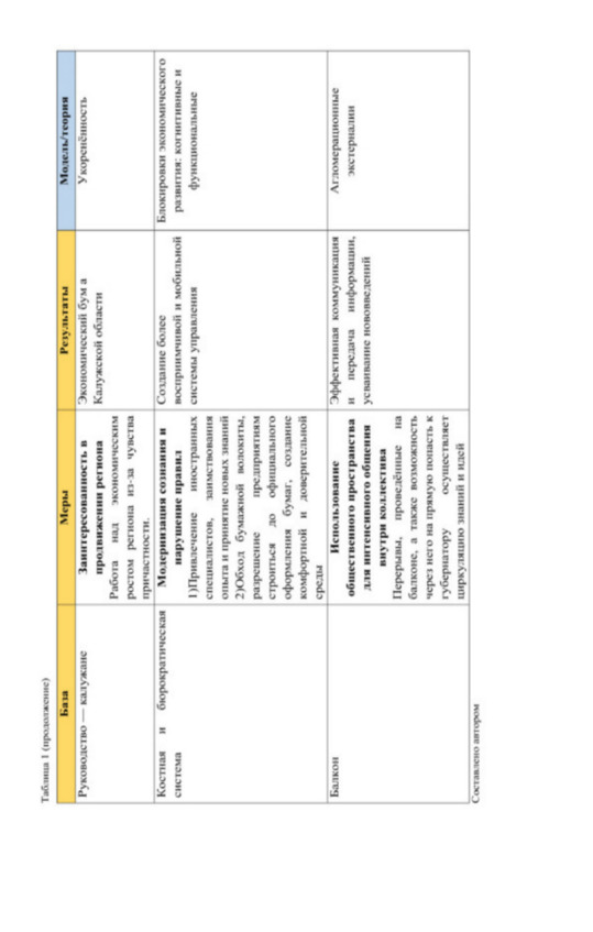 Такой пример существует и в модели Калужского экономического чуда, отличаясь русской спецификой. Агломерационной экстерналией, местом внедрения инновационных идей и подходов, связующим звеном между губернатором и подчинёнными, ускоряющим процесс передачи информации служил балкон.