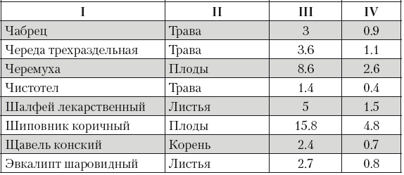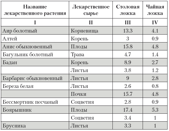 Столбец IV – количество сырья в граммах вещества, равное одной чайной ложке.
