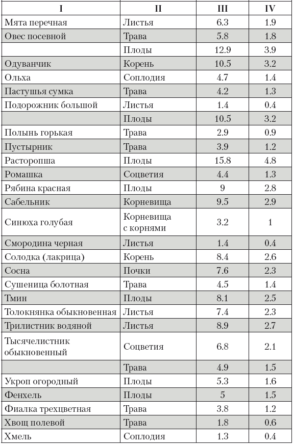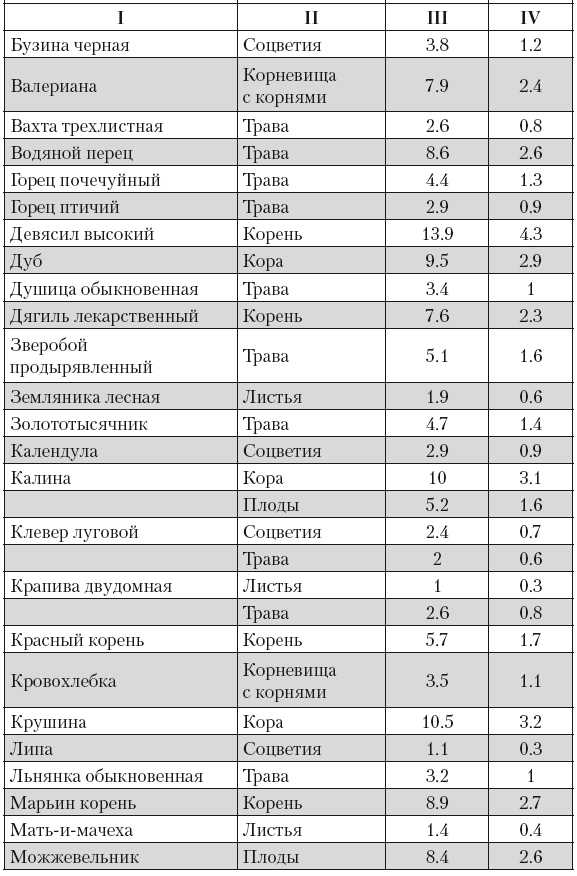 Столбец III – количество сырья в граммах вещества, равное одной столовой ложке.