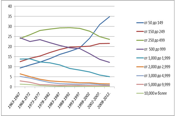 Здесь под масштабом мы понимаем количество делегатов, участвующих в мероприятии. По национальному стандарту РФ малыми считаются мероприятия с количеством делегатов до 250 человек, средними 250—1000, крупными – более 1000. Для того чтобы формировать статистику, делать выводы и принимать управленческие решения, такая градация не очень показательна. Международная ассоциация ICCA в своих аналитических отчетах разделяет мероприятия по масштабу на 9 групп от 50 до 10000 и более. Такая детализация позволяет более внимательно отслеживать динамику ситуации на рынке, изменение тенденций по росту или снижению количества мероприятий в мире, изменение поведения инициаторов в части принятия решений о проведении конгресса в том или ином регионе. Например, отчеты, основанные на детализированных данных, позволяют инвесторам оценивать привлекательность проектов конгрессных центров, рассчитывать сроки окупаемости. Например, если посмотреть на тенденции изменения количества конгрессов в разных группах за период 1963—2012, то мы увидим, как стремительно сокращается количество очень крупных конгрессов (от 1000 делегатов), растет число малых (50—149 делегатов) и средних (150—249 делегатов) мероприятий. Кстати, именно поэтому конгрессные центры во всем мире крайне редко находятся в частной собственности. Как правило, это те или формы государственно-частного партнерства.