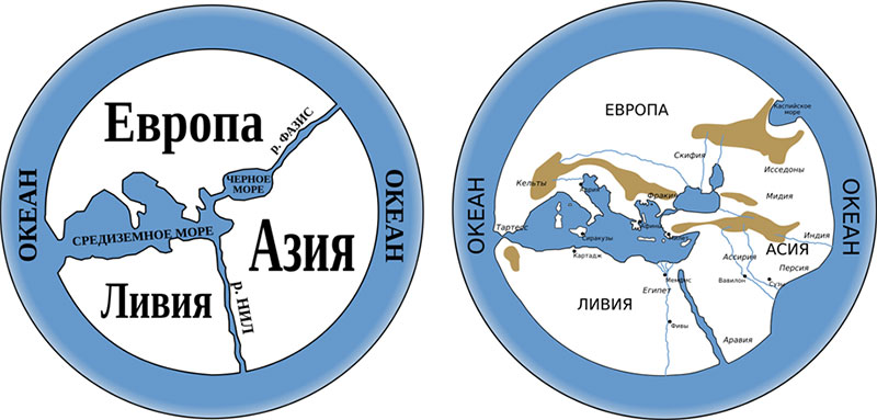 Рисунок 1. Карта мира по Анаксимандру (слева) и карта мира по Гекатею (справа), V век до н. э., современные реконструкции