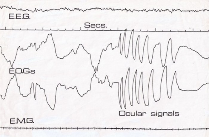 Рисунок 2. Последовательность сигналов от левого к правому глазу, записанная в Ливерпульском университете с использованием полиграфа Grass. Обратите внимание на предшествующую сигналам вспышку быстрого сна – эффект, открытый доктором Хирном. ЭЭГ – электроэнцефалограф (отслеживание мозговых волн) ЭОГ- электроокулограф (отслеживание движений глаз) ЭМГ – электромиограф (отслеживание мышечной активности)