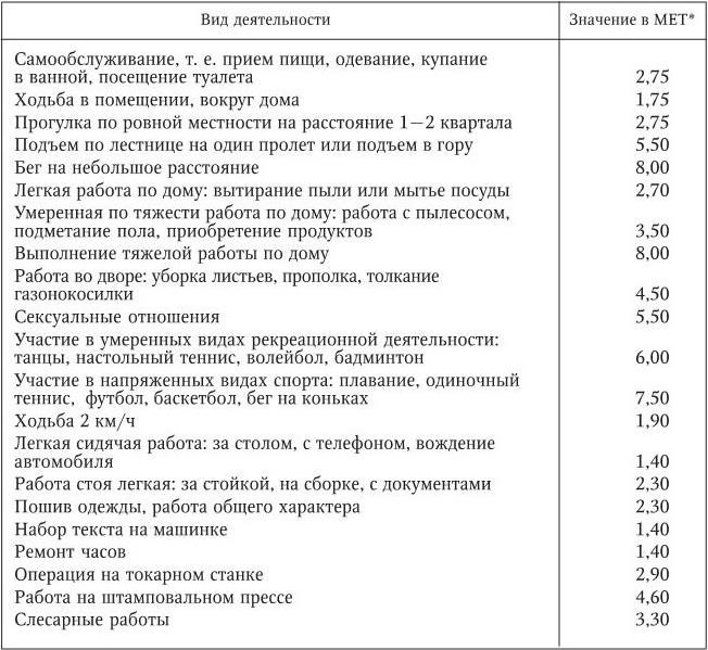Уровень физической активности можно определить по опроснику переносимости различных видов деятельности, в котором каждый из видов оценен в МЕТ с помощью физиологического обследования [25], табл. 1. Отражает состояние системы кровообращения опросник качества жизни – исследование качества жизни.