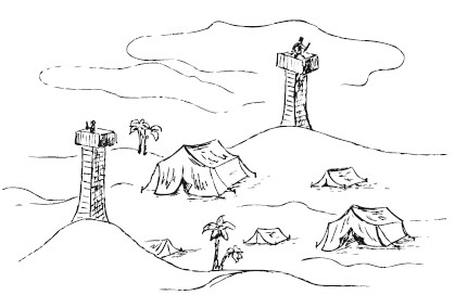 Пустыня. Много палаток. Некоторые побольше, как шатры. На барханах в округе вышки. На них русские охранники-вертухаи, нафаршированные оружием, в бронежилетах, в шлемах, зорко наблюдают, не блеснёт ли из-за горизонта дуло вражеского танка. Обширная палатка, похожая на шатёр хана Золотой Орды. За столом в удобном кресле сидит русский олигарх Архипыч.