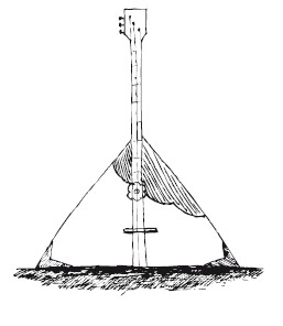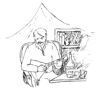 В руках у него балалайка. Наигрывает Бетховена, первые аккорды Пятой сонаты «Судьба стучится в дверь», фальшивит. Сзади него книжные полки с русской классикой: Толстой, Чехов, Тургенев… Перед ним на столе бутылка самогона.