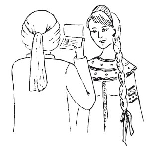Мочилиус проверяет паспорта. Внимательно смотрит на паспорт Красавки, потом так же внимательно ей в лицо, снова на паспорт и снова в лицо.