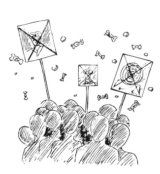 Толпа «бунтовщиков». Сплошное отребье и бомжи. С грузовика агенты влияния под руководством агента 00 раздают гуманитарную помощь: конфетки, печенье, маленькие, как в самолётах, бутылочки спиртного, разную другую красиво упакованную мелочёвку. Над грузовиком – портрет короля, перечёркнутый жирно красным крестом. Оборванцы напирают на грузовик со всех сторон.