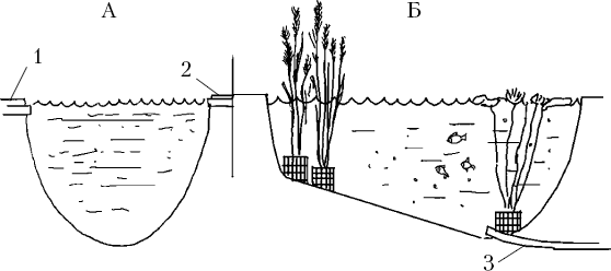 Пруд без уступов для высаживания водных растений. А – поперечный разрез пруда; Б – продольный разрез пруда; 1 – трубопровод, который соединяет последний отстойник с прудом; 2 – трубопровод для отвода излишков воды; 3 – трубопровод для полива садово-огородных культур и полного спуска воды в пруду