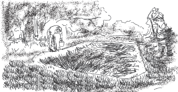 Условно разбив контур будущего пруда на четыре части, начинайте копать со стороны высочайшей точки горизонта вашей местности.