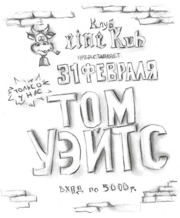 – Что-о-о?! Да если бы сейчас сюда зашел бы Том Уэйтс, он бы пожал мне руку!!! Переговоры щас веду с ним! Хочу в нашем клубе концерт его сделать! По пять тыщ рублей билет стоить будет!