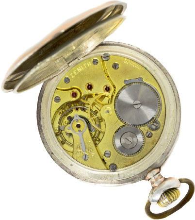 Старинные карманные часы в разобранном виде. Справа хорошо видны шестеренки и прочие детали механизма