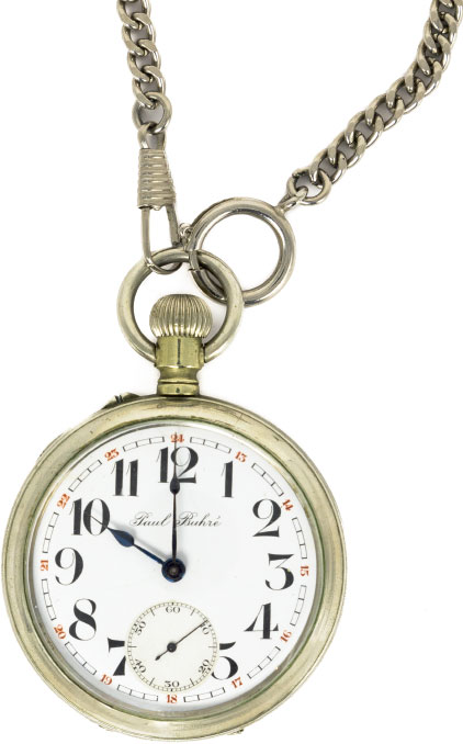 «Павел Буре» сборки 1920–1922 годов. Название торгового дома на циферблате написано латиницей на языке оригинала, часы оснащены дополнительной секундной стрелкой