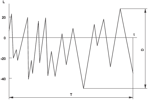 Рис. 1.7. Зависимость уровня сигнала от времени: L – уровень сигнала; t – время; T – длительность сигнала; D – динамический диапазон