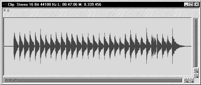 Clip – это область памяти для хранения выборок из Wave projects, которые копируются из окна волнового проекта и могут быть вставлены в тот же самый или в другой волновой проект. Кроме того, содержимое Clip может также быть смешано с содержимым окна другого волнового проекта. Clip всегда создается с атрибутами из проекта (разрядность в битах, частота дискретизации, моно/стерео режим, левый/правый канал) и представлен на экране окном, которое содержит слово «Clip» в своем названии и вид которого продемонстрирован на рис. 1.8. Другими словами, Clip выглядит как любой другой проект, который можно воспроизвести, редактировать и сохранить с любым именем.