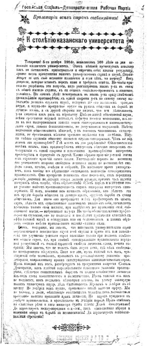 Несмотря на то что Тарасов-Родионов был избит и задержан, ему было приятно сознавать тот факт, что он стал причастен к событиям, взбудоражившим весь город, что наравне с другими смело и решительно отстаивал свои права, боролся за равноправие и справедливость. Это укрепило его в правоте своих действий, и он решительней становится на путь более активного участия в революционной борьбе. Первым его шагом на этом пути было вступление в университетский социал-демократический партийный кружок, в котором он за короткое время становится лидером. Не случайно, заполняя 1 июля 1921 г. анкету, «Личный листок» Московского комитета РКП(б), на вопрос: какой партийной организацией принят в члены РКП (больш.), он отвечает: «Казанской организацией, студенческим кружком Р.С.Д.Р.П. в 1905 году, 26 января»[18].