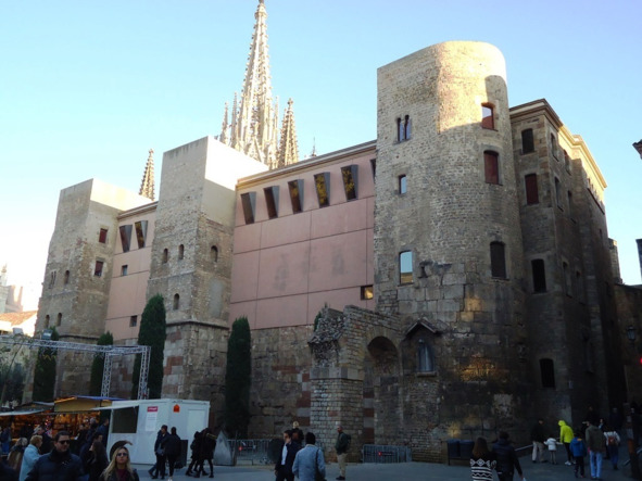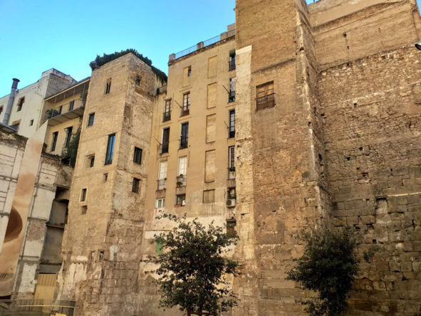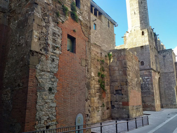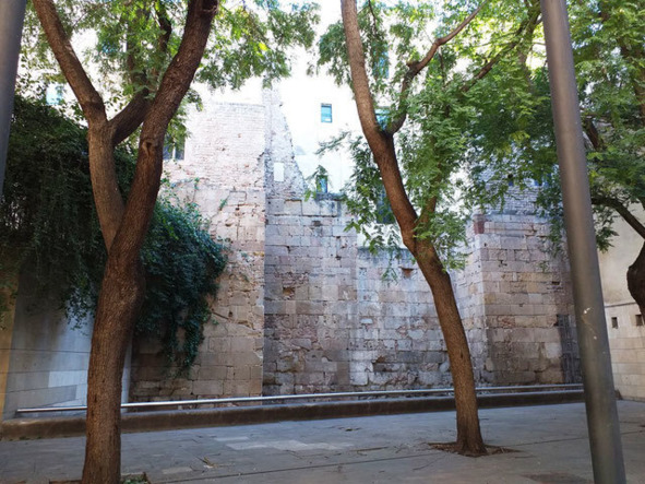 Повернув направо, на улицу calle Tapineria, мы легко сможем проследить крепостной периметр с сохранившимися фрагментам рва вплоть до площади plaza de Ramón Berenguer el Grande, где замечательно просматриввается не только стена с башнями, но и построенная на ее основании церковь Святой Агаты, принадлежавшая комплексу Большого Королевского дворца.